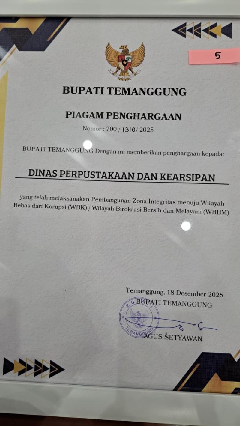 Kategori Smart Government (Pemerintah Cerdas) Kategori: Smart Government (Pemerintah Cerdas) Bidang Kearsipan 24 Desember 2025 15:06:00 17 Kegiatan pendampingan penyusutan arsip Dinas Kebudayaan dan Pariwisata Selengkapnya Kategori: Smart Government (Pemerintah Cerdas) Bidang Kearsipan 24 Desember 2025 14:58:00 14 Kegiatan pendampingan penyusutan arsip perumda Bhumi Phala Selengkapnya Kategori: Smart Government (Pemerintah Cerdas) Bidang Kearsipan 23 Desember 2025 08:38:00 29 Kegiatan penyusunan usulan SOP bidang Kearsipan Selengkapnya Kategori: Smart Government (Pemerintah Cerdas) Sekretariat 23 Desember 2025 08:16:00 21 Kegiatan apel luar biasa Peringatan Hari Ibu Selengkapnya Kategori: Smart Government (Pemerintah Cerdas) Sekretariat 19 Desember 2025 14:17:00 17 Kegiatan penerimaan kunjungan dari DINPERSIP Kabupaten Bantul Selengkapnya Kategori: Smart Government (Pemerintah Cerdas) Sekretariat 18 Desember 2025 13:31:00 26 Monitoring dan evaluasi Bantuan Buku dari Perpusnas di Puskesmas Candiroto Selengkapnya Kategori: Smart Government (Pemerintah Cerdas) Sekretariat 18 Desember 2025 13:24:00 21 Monitoring dan evaluasi Bantuan Buku dari Perpusnas di Lapas Temanggung Selengkapnya Kategori: Smart Government (Pemerintah Cerdas) Sekretariat 18 Desember 2025 08:27:00 11 Penerimaan Piagam Penghargaan Pembangunan Zona Integritas Selengkapnya Kategori: Smart Government (Pemerintah Cerdas) Sekretariat 17 Desember 2025 13:58:00 28 Penyerahan bantuan Gesbuk Perpustakaan Kec. Tretep Selengkapnya Kategori: Smart Government (Pemerintah Cerdas) Sekretariat 16 Desember 2025 13:47:00 36 Rapat Kegiatan Pemusnahan Arsip Perangkat Daerah Kabupaten Temanggung Selengkapnya Kategori: Smart Government (Pemerintah Cerdas) Sekretariat 15 Desember 2025 15:56:00 33 Kegiatan konsultasi pemusnahan arsip dari KPU Temanggung Selengkapnya Kategori: Smart Government (Pemerintah Cerdas) Bidang Perpustakaan 15 Desember 2025 13:31:00 24 Konsultasi Publik Penyusunan RTKD Selengkapnya 123NextLast