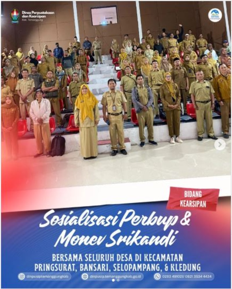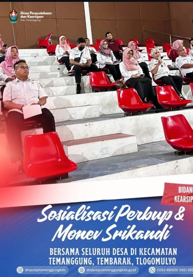 Kategori Smart Government (Pemerintah Cerdas) Kategori: Smart Government (Pemerintah Cerdas) Sekretariat 26 Maret 2026 08:16:00 1 Penerimaan ASN mutasi dari Satpol PP dan Damkar di Dinpusip Selengkapnya Kategori: Smart Government (Pemerintah Cerdas) Bidang Kearsipan 16 Maret 2026 09:52:00 1 Kegiatan rapat penilaian arsip usul musnah Dinperinaker Temanggung Selengkapnya Kategori: Smart Government (Pemerintah Cerdas) Bidang Kearsipan 12 Maret 2026 14:58:00 2 Kegiatan uji petik arsip usul musnah Dinas Kebudayaan dan Pariwisata Selengkapnya Kategori: Smart Government (Pemerintah Cerdas) Sekretariat 12 Maret 2026 09:17:00 0 Kegiatan Santapan Rohani Dinpusip Temanggung Maret 2026 Selengkapnya Kategori: Smart Government (Pemerintah Cerdas) Bidang Kearsipan 11 Maret 2026 09:09:00 0 Sosialisasi Peraturan Bupati Nomor 8 tahun 2026 dan Monitoring Srikandi bagi BUMD Selengkapnya Kategori: Smart Government (Pemerintah Cerdas) Bidang Kearsipan 10 Maret 2026 09:03:00 0 Sosialisasi Peraturan Bupati Nomor 8 tahun 2026 dan Monitoring Srikandi Seluruh desa di Kecamatan Gemawang, Jumo , Bejen dan Tretep Selengkapnya Kategori: Smart Government (Pemerintah Cerdas) Sekretariat 09 Maret 2026 08:45:00 1 Sosialisasi Perbup dan Monev Srikandi untuk Desa di Kecamatan Kaloran, Kandangan, dan Kranggan Selengkapnya Kategori: Smart Government (Pemerintah Cerdas) Bidang Kearsipan 05 Maret 2026 14:33:00 3 Pendampingan Kegiatan Rapat Penilaian Pemusnahan Arsip di BKPSDM Selengkapnya Kategori: Smart Government (Pemerintah Cerdas) Sekretariat 04 Maret 2026 08:52:00 1 Sosialisasi Peraturan Bupati Nomor 8 tahun 2026 dan Monitoring Srikandi bagi desa di Kecamatan Temanggung, Kledung dan Tlogomulyo Selengkapnya Kategori: Smart Government (Pemerintah Cerdas) Sekretariat 03 Maret 2026 14:42:00 3 Pemusnahan Arsip Dinas Kominfo Kabupaten Temanggung Selengkapnya Kategori: Smart Government (Pemerintah Cerdas) Bidang Kearsipan 03 Maret 2026 14:32:00 2 Sosialisasi Peraturan Bupati Temanggung Nomor 8 tahun 2026 Tentang Pedoman Penerapan Srikandi ke Desa Selengkapnya Kategori: Smart Government (Pemerintah Cerdas) Sekretariat 25 Februari 2026 14:43:00 2 Rapat koordinasi bidang perpustakaan untuk kegiatan 2026 dan prioritas rencana kegiatan 2027 Selengkapnya 123NextLast